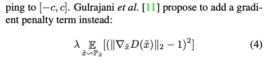 WGAN에서의 [-c,c] weight clipping을 말하면서 [11] 에서 이것 대신 적용하기로 제안한 gradient penalty term(4)을 소개