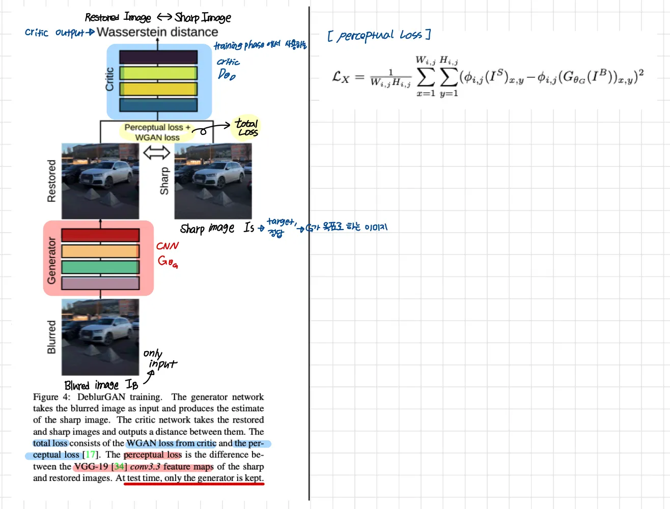대신에 DeblurGAN에서는 Perceptual loss를 수용하였다. Perceptual loss는 간단한 L2-loss이지만, generated image와 target image의 CNN feature map의 차이를 기반하고 있다.