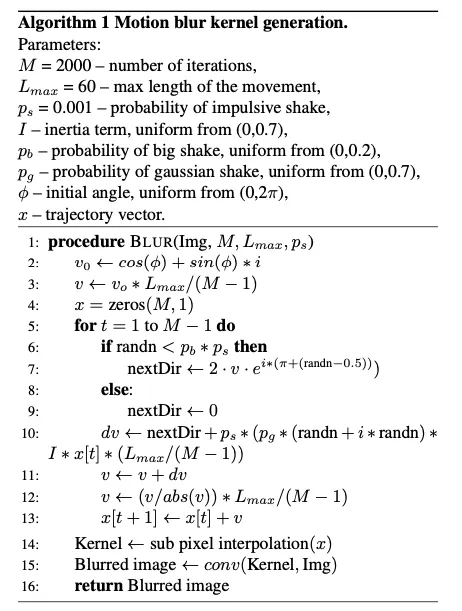 우리는 sharp image 세트에서 자동화된 방식으로 motion deblurring training 위한 데이터 세트를 생성하기 위한 무작위 trajectories(궤적)을 기반으로 한 방법을 제시합니다.