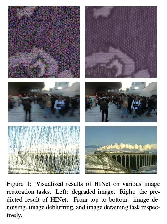 HIN Block에 기반해 이미지 복원을 위한 multi stage architecture HINet을 디자인, SOTA 성능 달성. SOTA방법들과 비교해 더 적은 MACs와 inference time