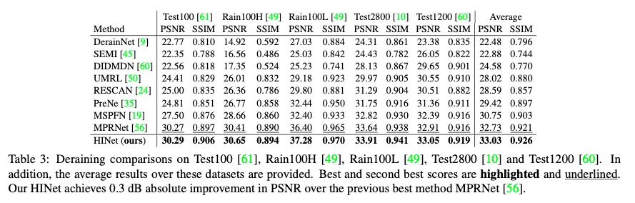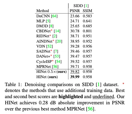 SOTA아키텍쳐인 MPRNet과 비교해, HINet이 다양한 task에서 앞섰다