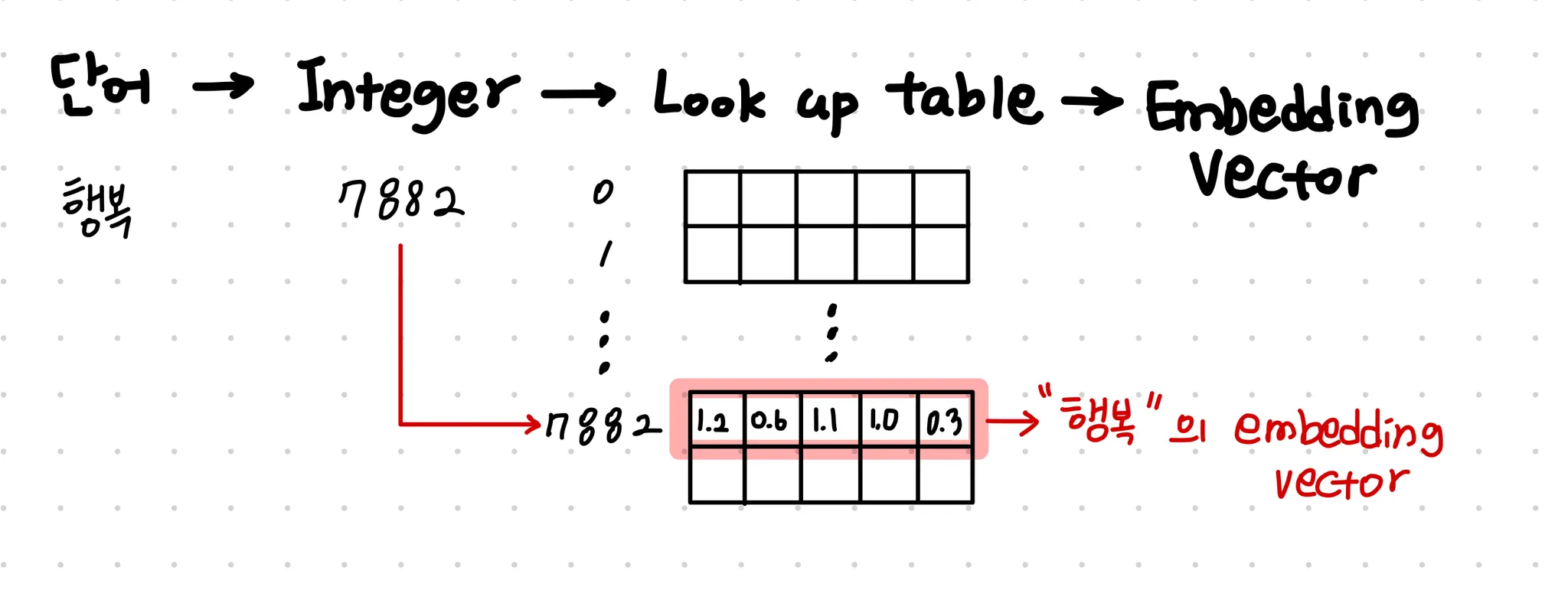 단어 → 단어에 해당하는 정수값 → embedding 층 통과 → dense vector