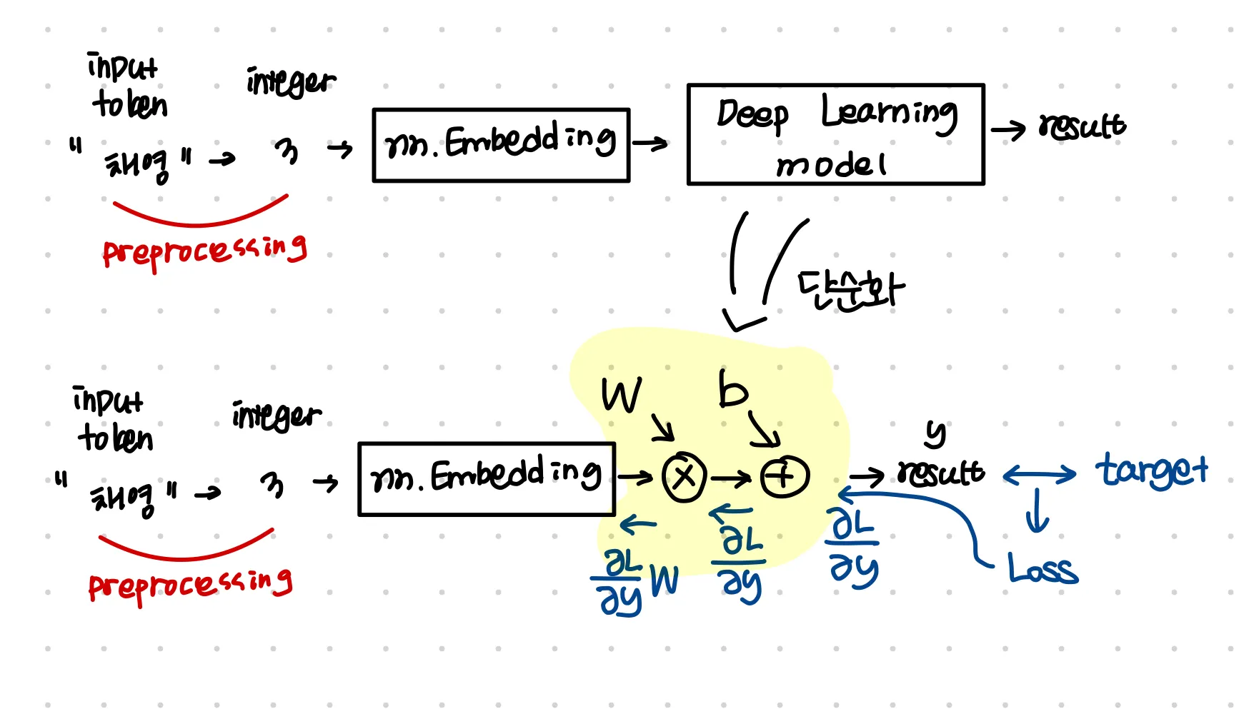 이 임베딩 레이어의 학습은 다음과 같이 일반 weight를 update하는 방식처럼 gradient descent를 통해 업데이트가 된다.