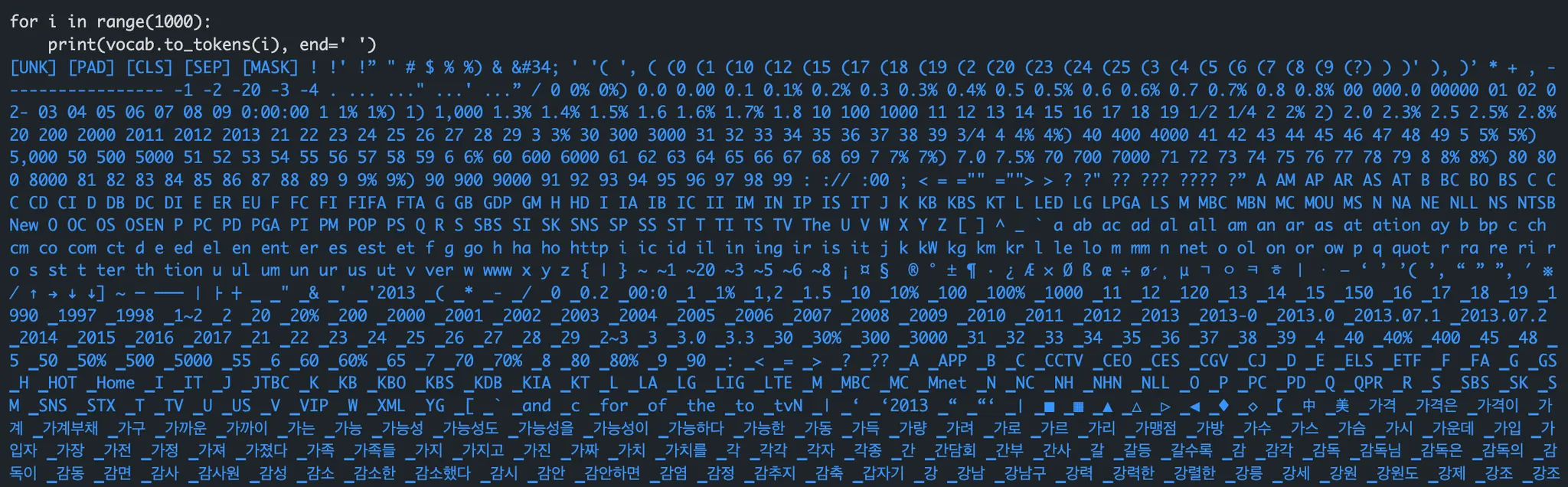 간단한 문장으로 token(단어) key들과 그에 해당하는 정수값 values로 이뤄진 vocaburary 생성