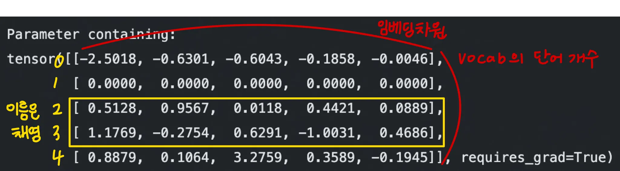 embedding_layer = nn.Embedding(num_embeddings=len(vocab),#단어개수