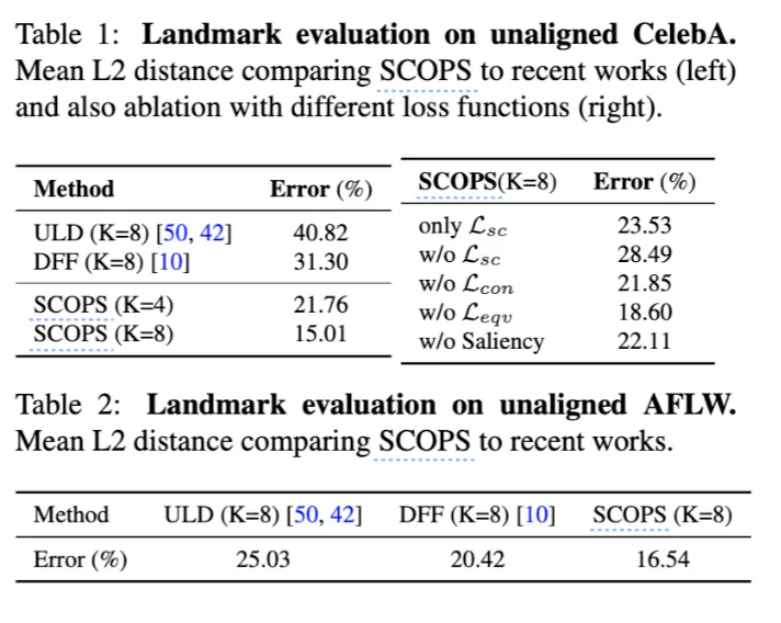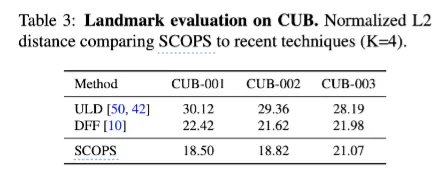 CelebA와 AFLW, CUB에 대해서는 part segmentation을 landmark로 바꿔서 GT annotations와 비교했다. ( part segmentation 결과 뒤에 linear regressor 추가해 바꿈 )