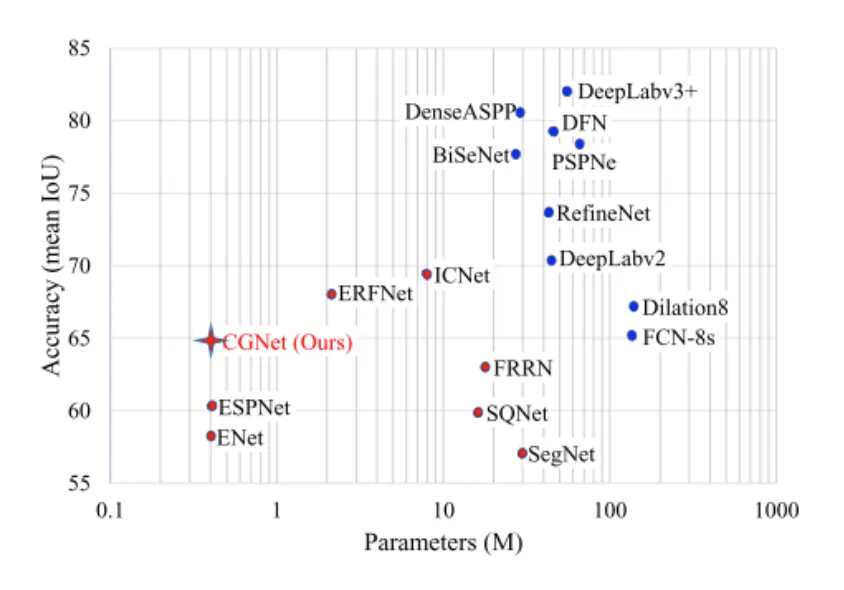 CGNet은 파라미터 수를 줄이고 메모리 공간을 절약하도록 정교하게 설계됐다.