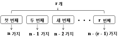 이를 식으로 정리하면 n개 요소중 r개를 나열하는 경우의 수는 n(n-1)(n-2)…(n-(r-1)) 가지이다.