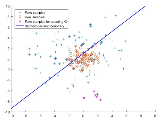 sigmoid decision boundary 위의 데이터들은 fake로, 아래 있는 데이터들은 real로 판단한다.