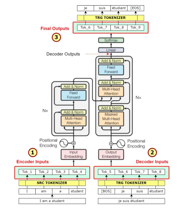final outputs : Target Sentence + [EOS]가 target tokenizer에 의해 생성되는 indexed tokens.