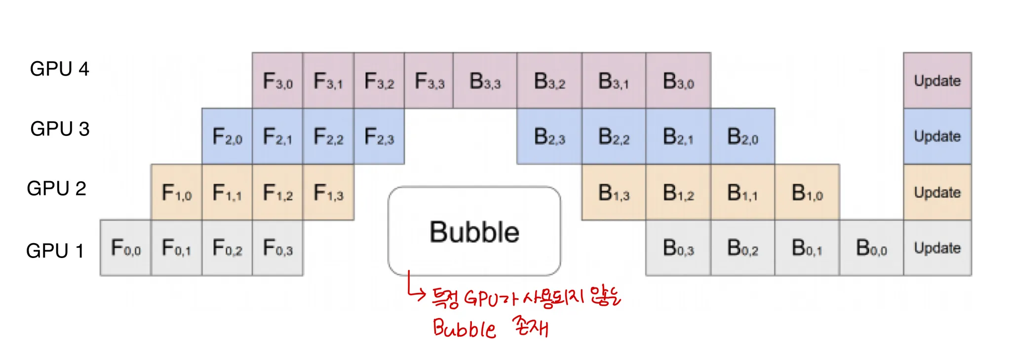 pipeline parallelism을 사용하면 다음과 같이 input batch가 여러개의 micro batches로 나뉘고 이 micro batches의 실행을 GPU에 파이프라인화 한다.
