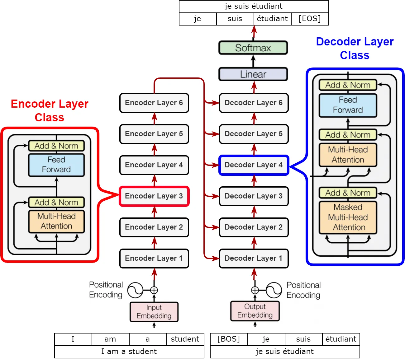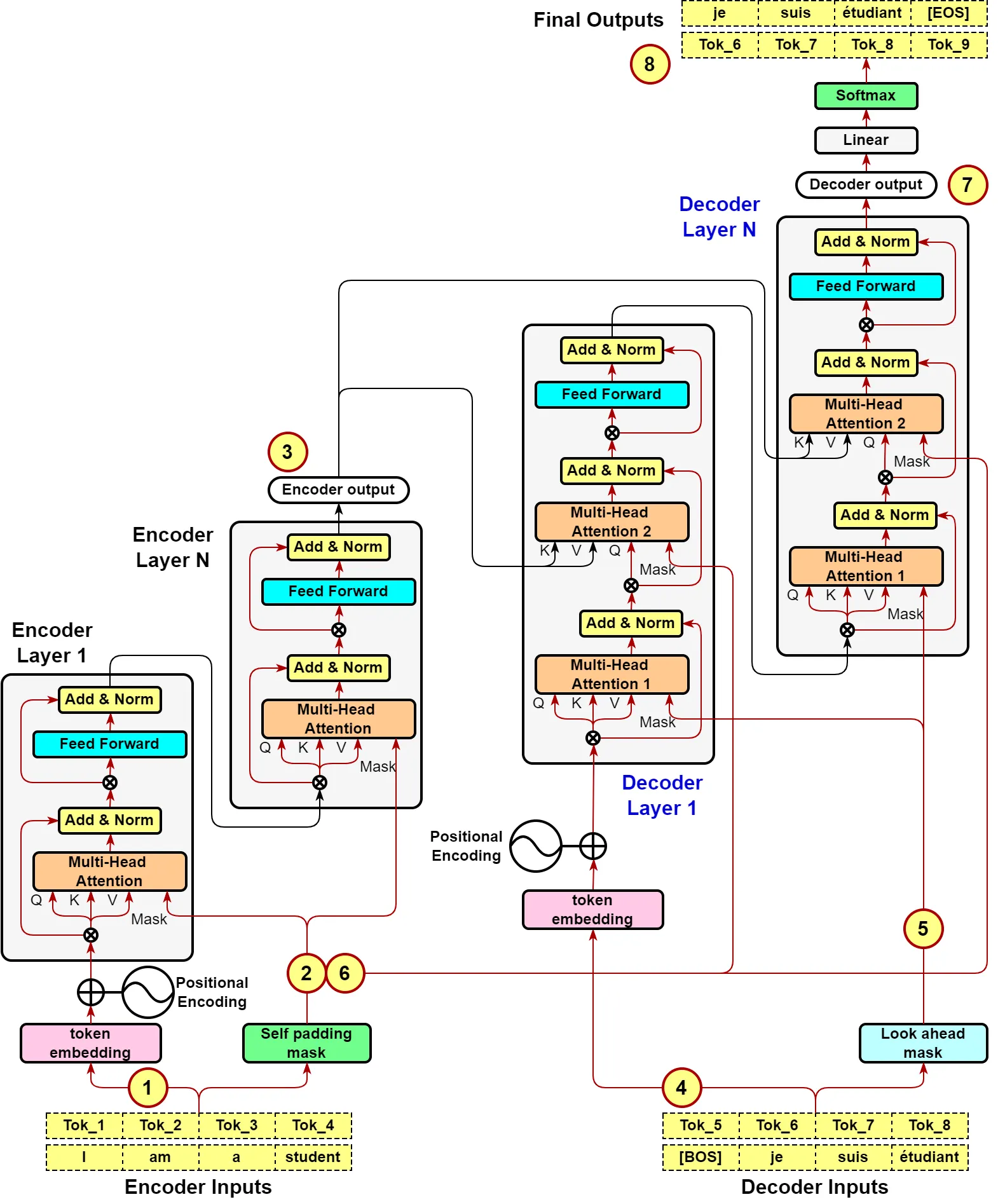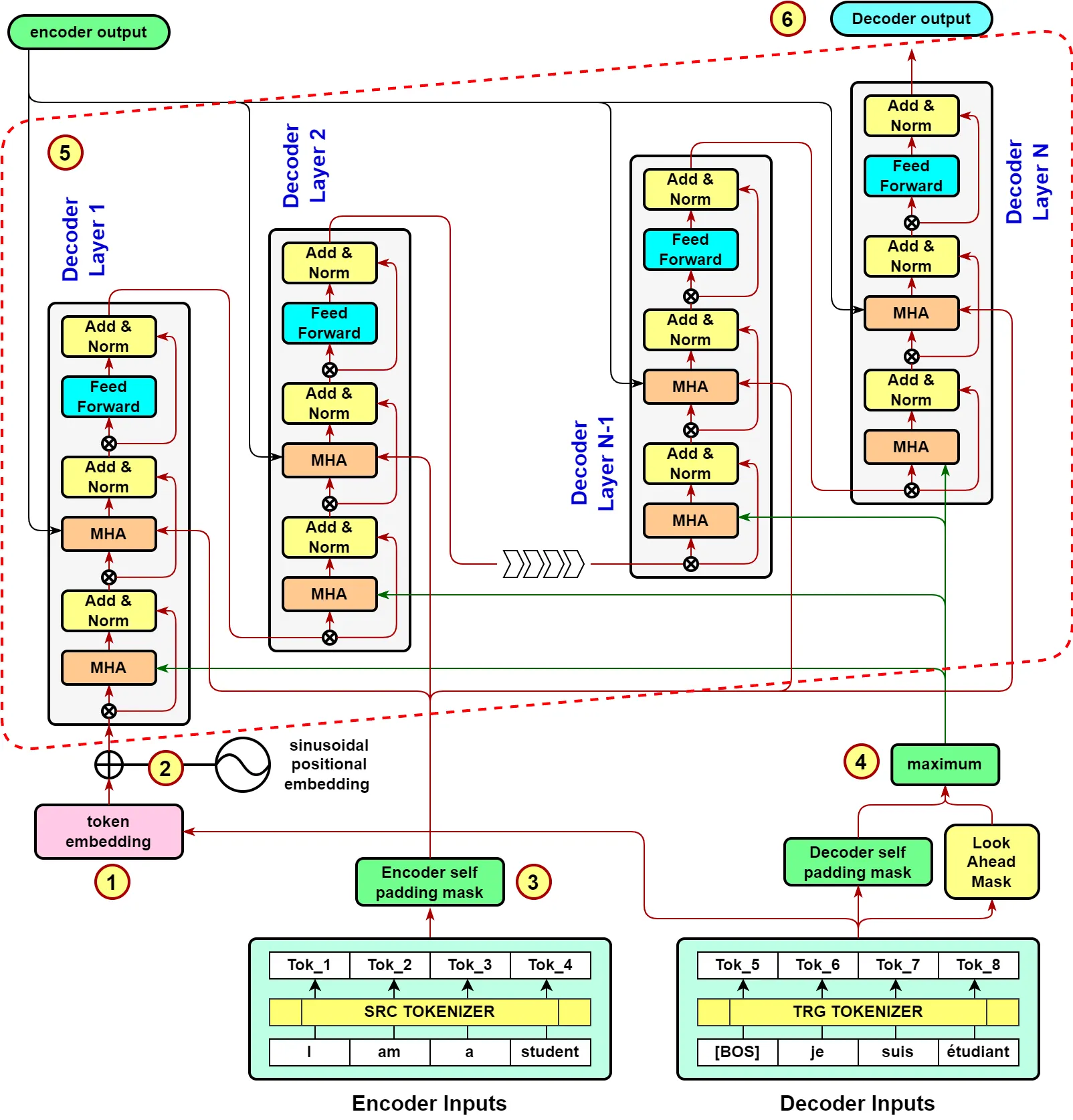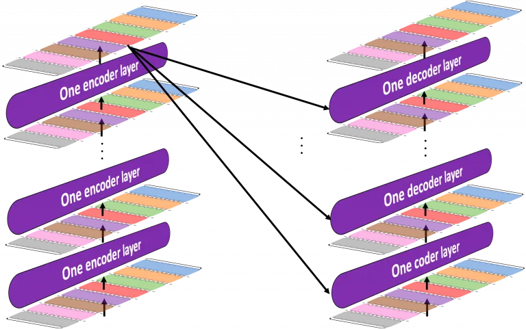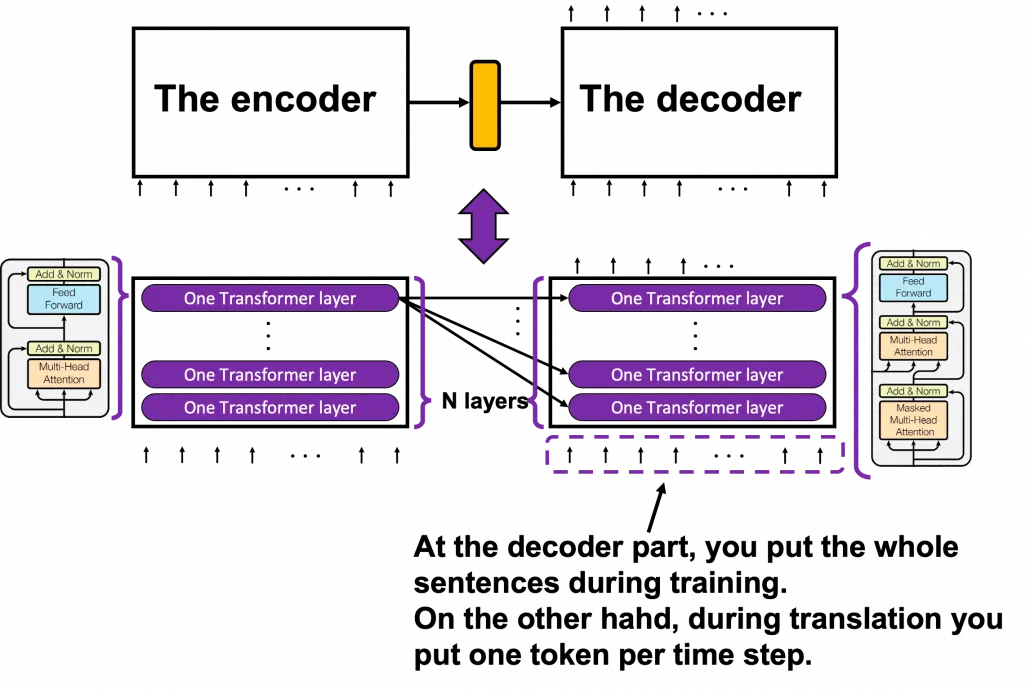 encoder 부분에서 N개의 레이어로 원래 입력 문장을 계속해서 변환하면, decoder부분에서는 N개의 레이어로 입력을 변환하면서 모든레이어에서 encoder 최종 output을 입력으로 받는다.