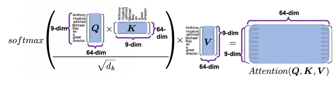 (9, 64)의 Q와 (64, 9)의 K가 matmul되어 (9, 9)차원의 가중치가 연산되면, (9, 64) 차원의 value에 matmul이 되어 ( 9, 64)의 attentioned values ( reweighted values )를 결과로 내놓게 된다.이