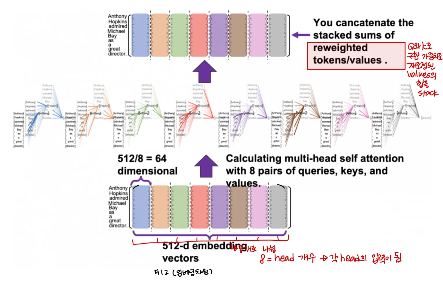 그림에서 다른색깔로 표현된 8개의 (9, 64) 텐서들은 모두 같은 문장을 나타내고, 각각 독립적으로 self attention을 수행해 value를 reweight한다. 각 색상은 각 head를 나타낸다고 볼 수 있다. 각 head에서 나온 reweighted values의 합계를 쌓아 다시 연결하면 입력 embedding과 같은 shape의 결과가 나온다.