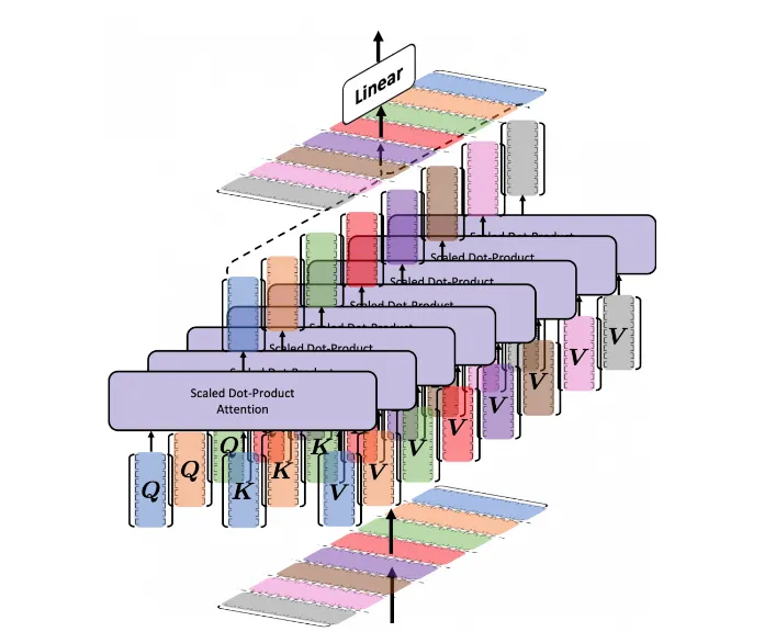 이 과정을 모든 head에서 반복하고, concat해서 Linear 레이어에 넣으면, multihead attention이 수행된다