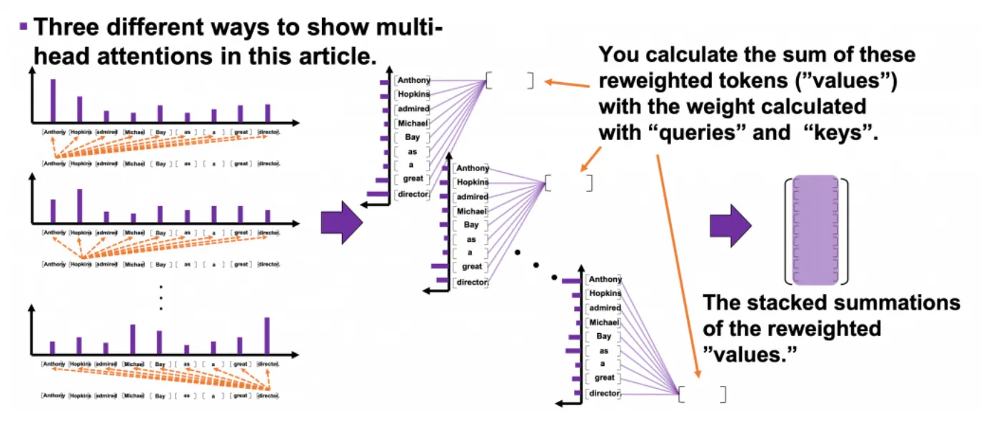 위의 그림처럼 모든 query에서 반복되어 생성된 reweighted values 9쌍의 합계가 stack된 것이 하나의 head의 output이다.