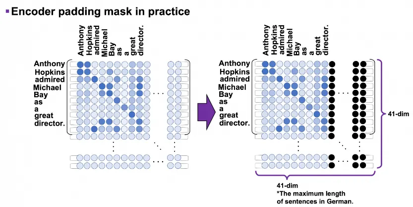 3번과정은 masked multi-head attention을 말한다. 이는 어려운 개념이 아니라 가장 긴 문장에 맞도록 입력 행렬의 크기를 고정시켜두고, 입력 문장의 최대길이가 41이라면 문장 길이가 41보다 짧아도 41만큼의 길이를 채워주는 것이다. 예를 들어 한 토큰에 대한 임베딩 차원크기가 64이고 최대 문장길이가 41이라면 항상 (64, 41)크기의 텐서가 생성되는 것이다. 그래서 실제로 위의 예시의 경우에도 (10, 9)크기의 attention map이 아니고 (41, 41) 크기의 attention map을 사용하게 된다.