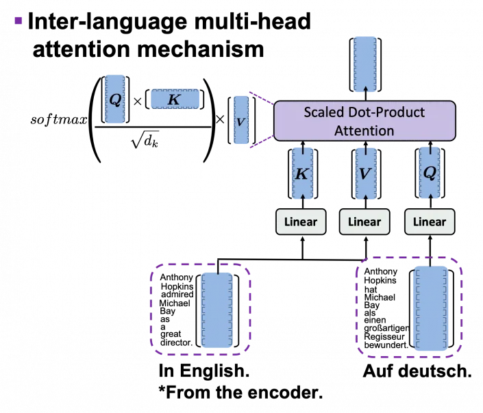 위의 그림에서 보여주는 것은 Decoder의 self-attention multihead attention 뿐 아니라 inter-language multi-head attention mechanism도 가지고 있다. 영어→독일어 변환의 경우에서 encoder의 output인 영어문장의 정보와 독일어 문장의 정보를 비교하게 되는 것이다.