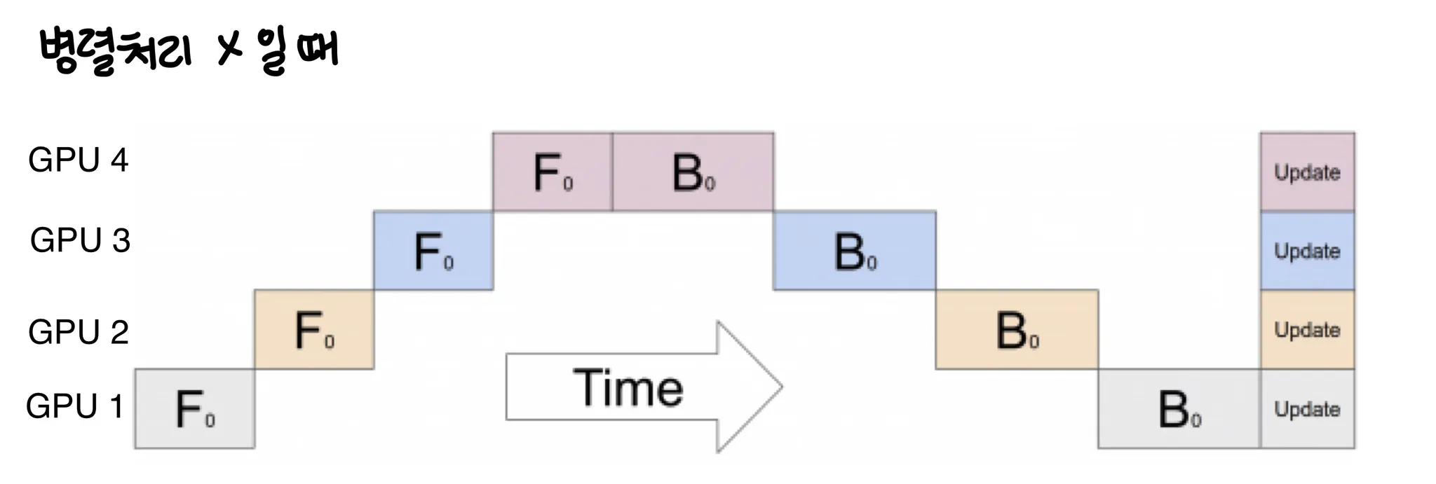 pytorch 튜토리얼에 따르면 병렬처리 하지 않았을 때 (Pipeline parallelism을 사용하지 않았을 때) training 과정을 그림으로 나타내면 다음과 같다.