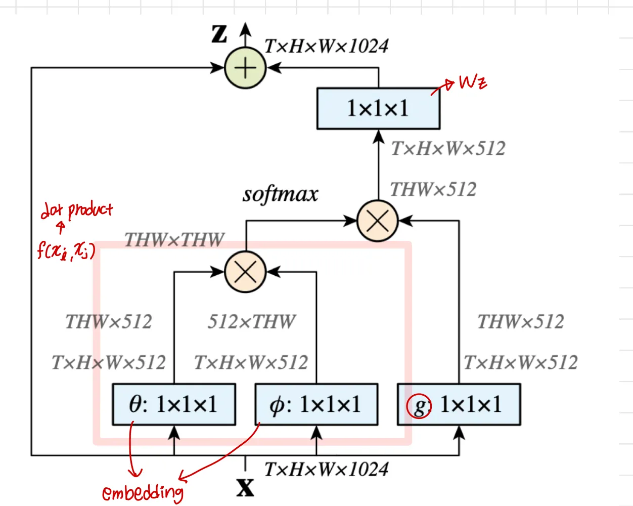 그림과 같이 , Gaussian, Embedded Gaussian, Dot product는 단순히 matrix곱으로 적용되었다