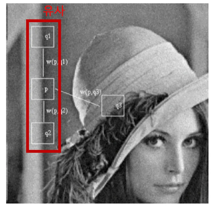예시) 위 사진에서 p 지점의 경우 p의 위 아래에 q1, q2와 같이 p와 유사한 구조의 지점들이 존재합니다. 때문에 한 영상 안에서도 이러한 유사한 영역들을 모아준 후 평균을 취해주면 여러장의 영상을 평균해 준 결과와 유사한 결과를 얻을 수 있습니다.