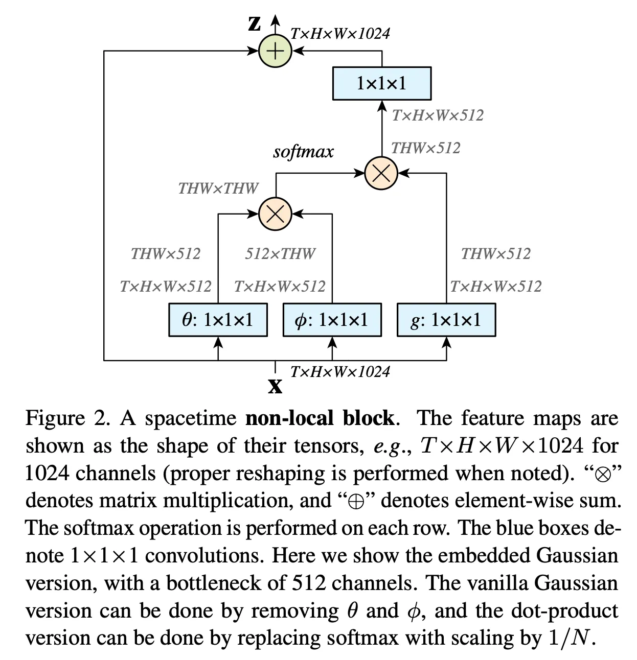 dot product와 embedded Gaussian versions의 주요 차이점은 softmax의 유무이며 softmax는 activation의 역할을 한다