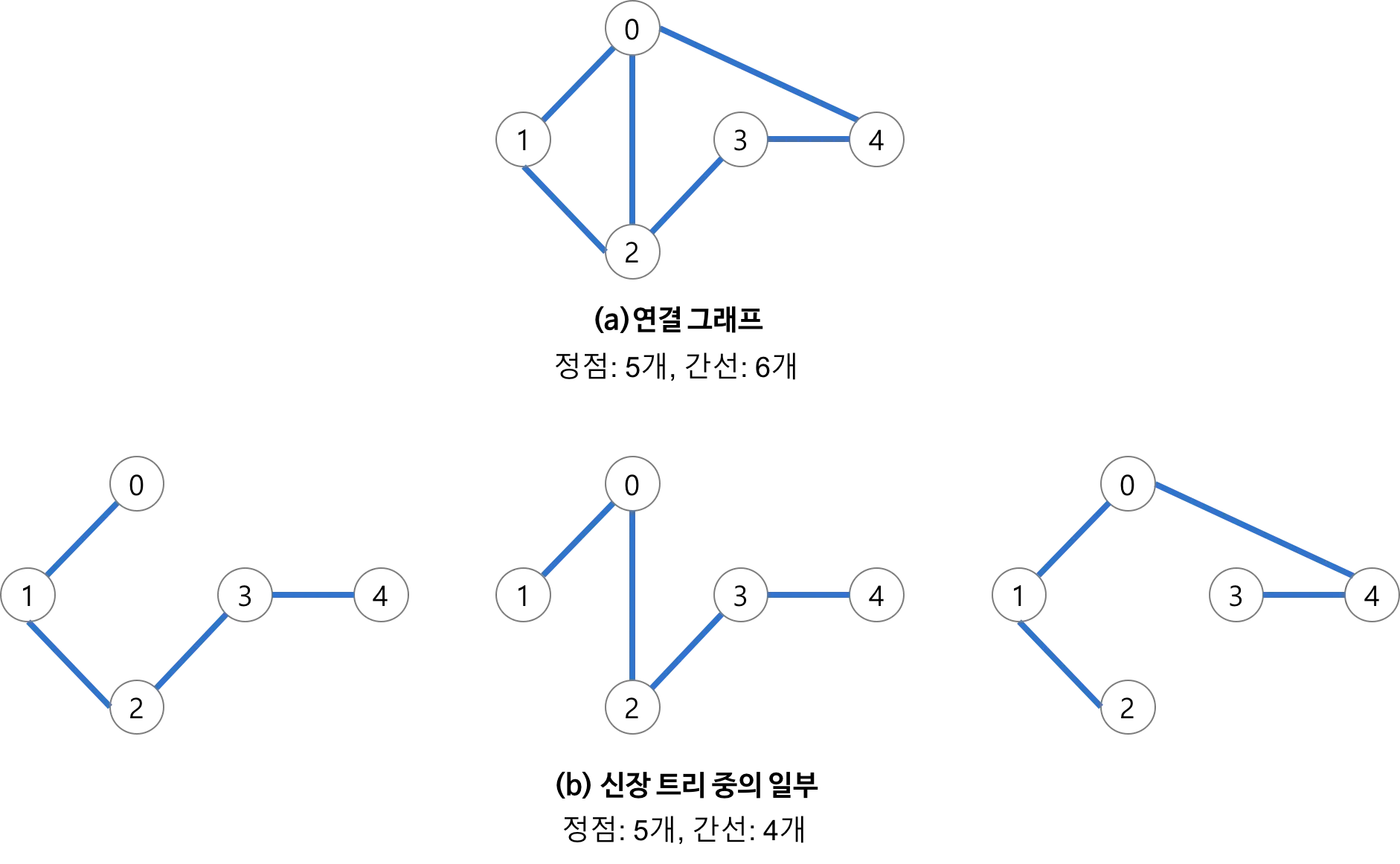 신장트리의 간선 수는 (노드수 -1)개이다. (트리의 기본적 특성)