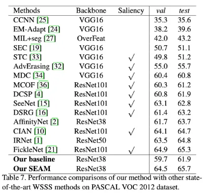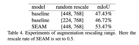 inference 시에는 SEAM이 shared-weight siamese network이기 떄문에 하나의 branch만 restored되었고 pseudo segmentation labels를 생성해 multi-scale and flip test 를 수행하였다.