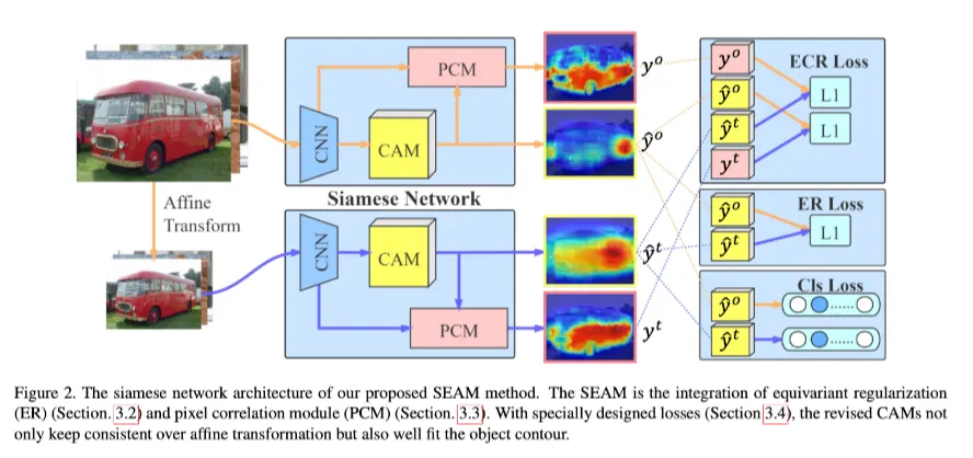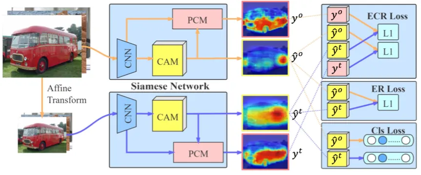 siamese network 구조로 equivariant cross regularization (ECR) Loss를 효과적으로 PCM과 self-supervision에 결합했다. 이를 통해 CAM에서 over-activated regions와 under-activated regions를 줄였다.