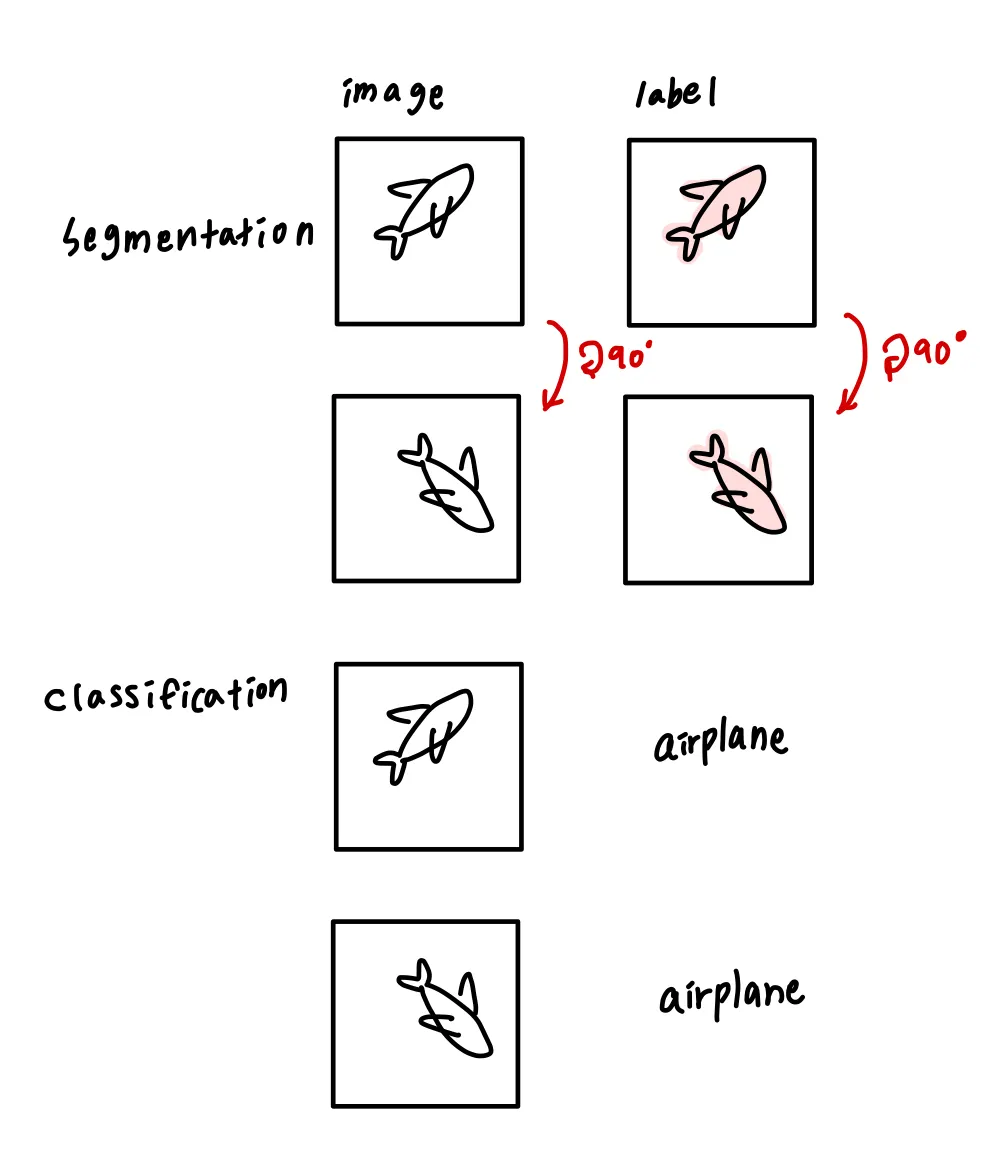 equivariance는 data augmentation 시에 input image에 적용되는 spatial transformation이 pixel-level labels에 똑같이 적용된다는 것이다.