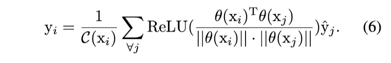 여기서 normalized feature space에서의 inner-product를 택해 현재 픽셀 i와 다른 픽셀들의 유사도를 계산했다. 이 f를 조금 변형해 Eq. (1)에 대입하면