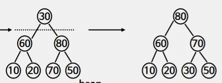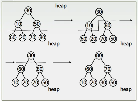 50, 70, 80으로 이뤄진 heap은 힙 조정을 통해 80을 부모노드로 옮기고 70과 50을 자식노드로 갖도록 한다.