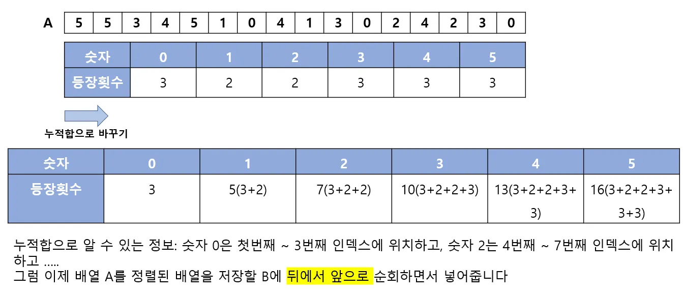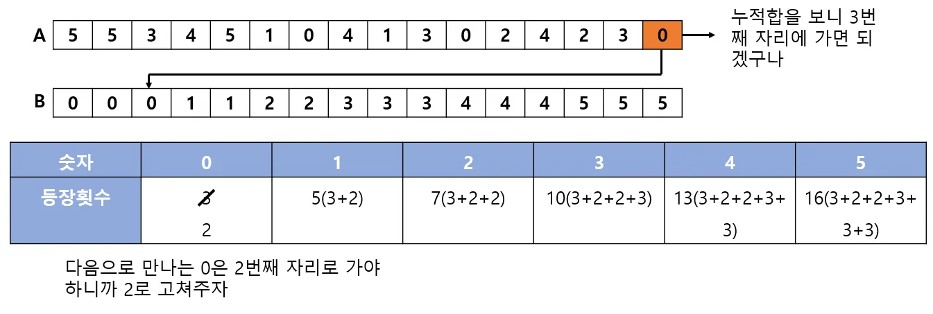 B배열(정렬된 배열) 채우는데 필요한 시간은 sum배열과 count배열의 합으로 볼 수 있으므로