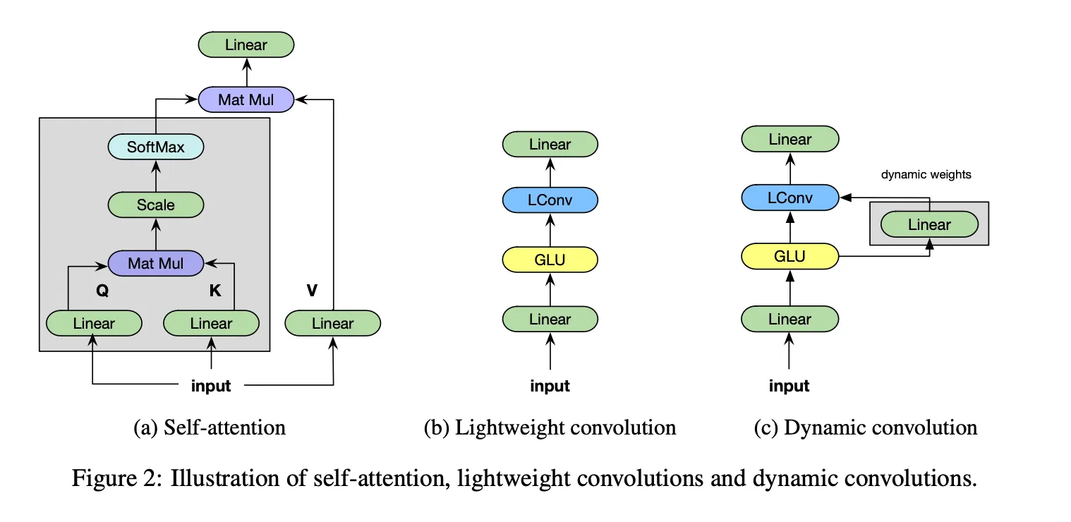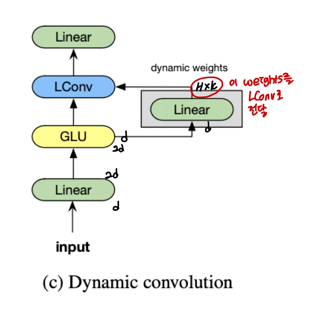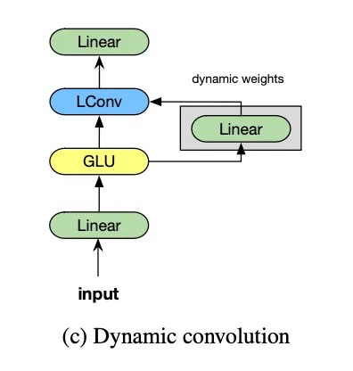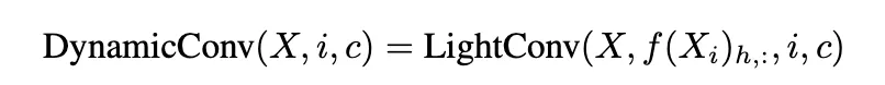 하지만 DynamicConv의 weights는 모든 context에 의존하지 않고 현재 time step에만 관련이 있는 함수이다.