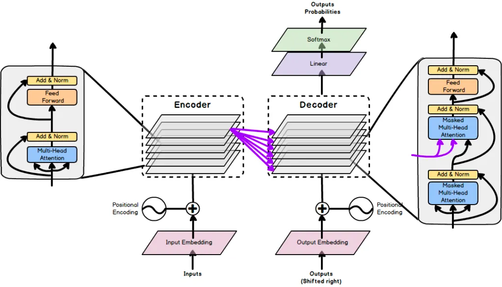Decoder block : encoder와 일치하지만 추가적인 source-target attention subblock이 self-attention 과 feed forward block 사이에 존재한다.
