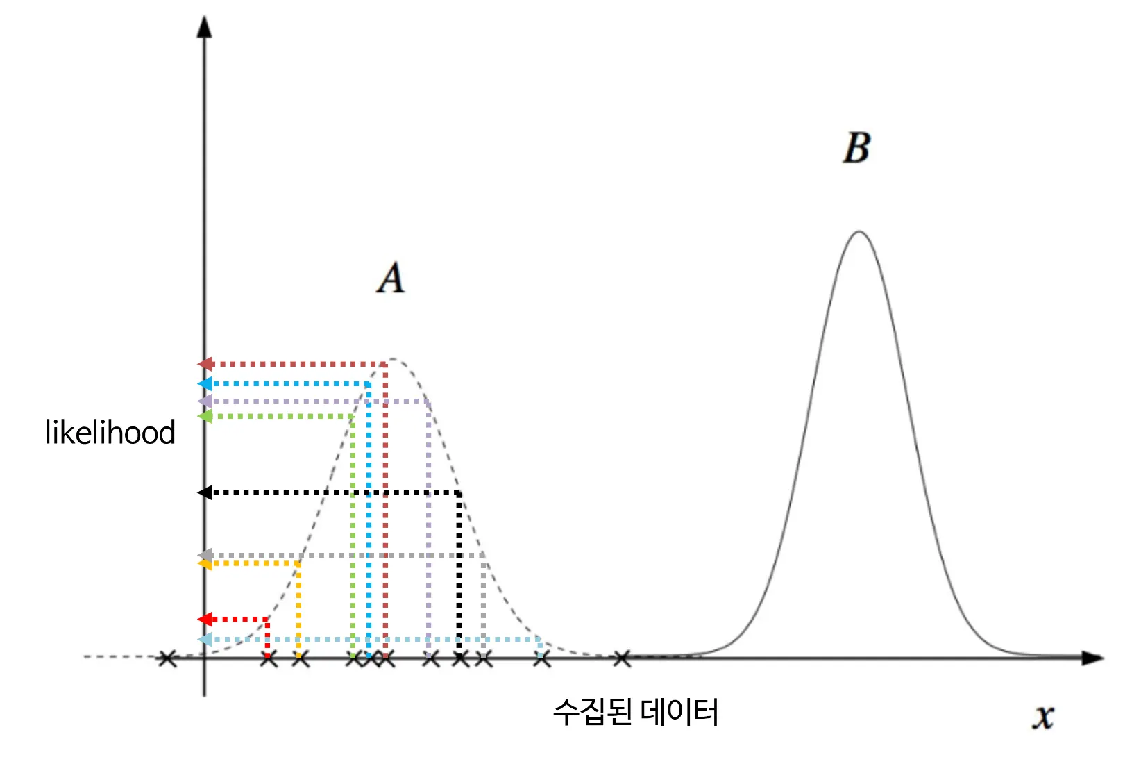 B의 경우 0에 수렴하게 되고 A의 경우 비교적 높은 likelihood를 갖게된다.
