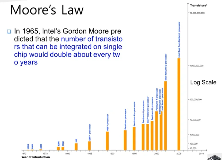 하나의 칩에 들어갈 수 있는 트랜지스터의 개수는 매 2년마다 2배씩 늘어날 것이다