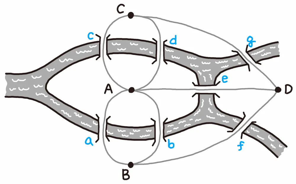 오일러는 쾨니히스베르크 다리에 a~g의 이름을 붙이고 도식화해 논문을 발표