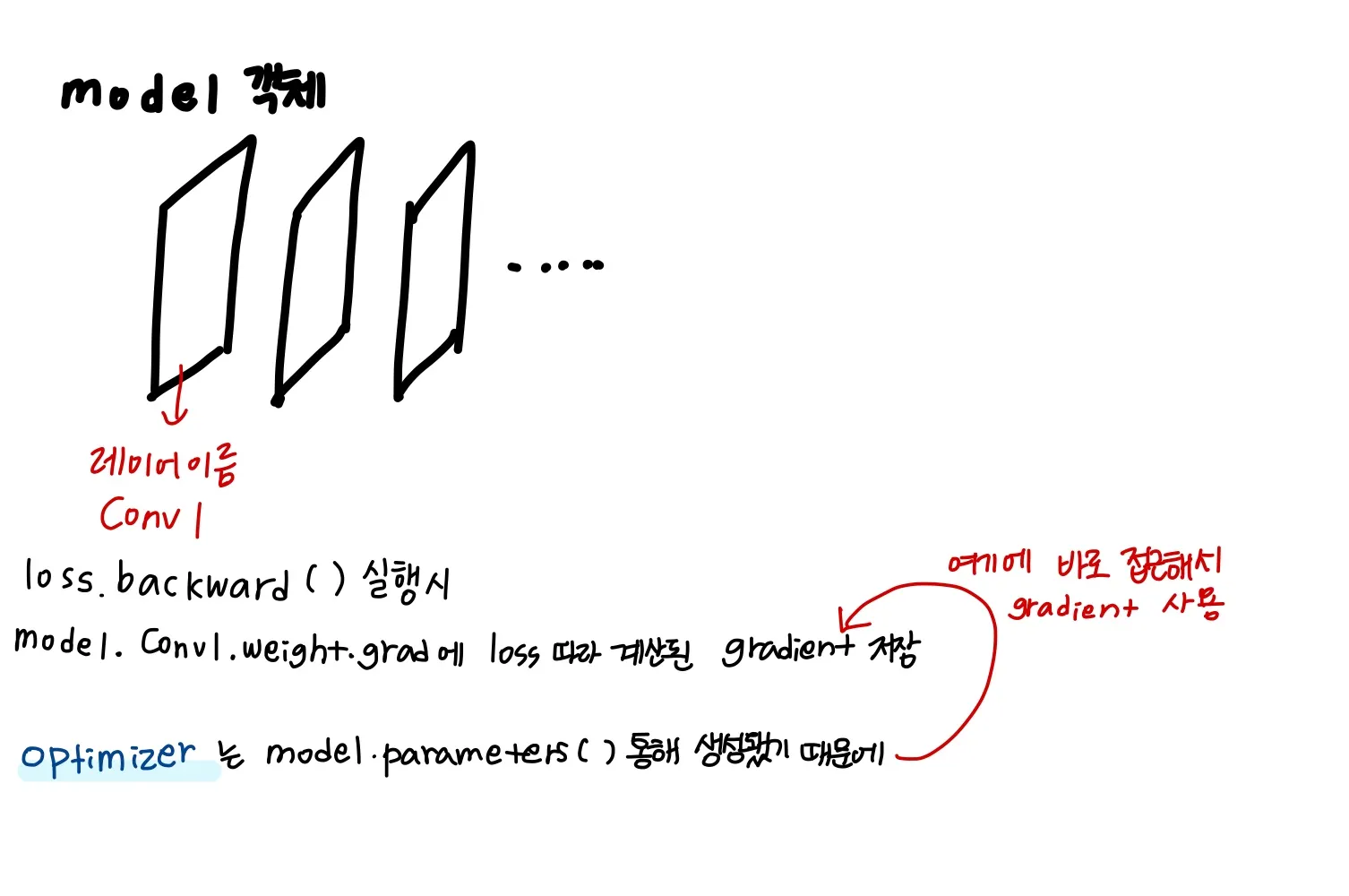 → loss에서 계산한 gradient를 기반으로 oprimizer로 weights 업데이트( optimizer.step() )