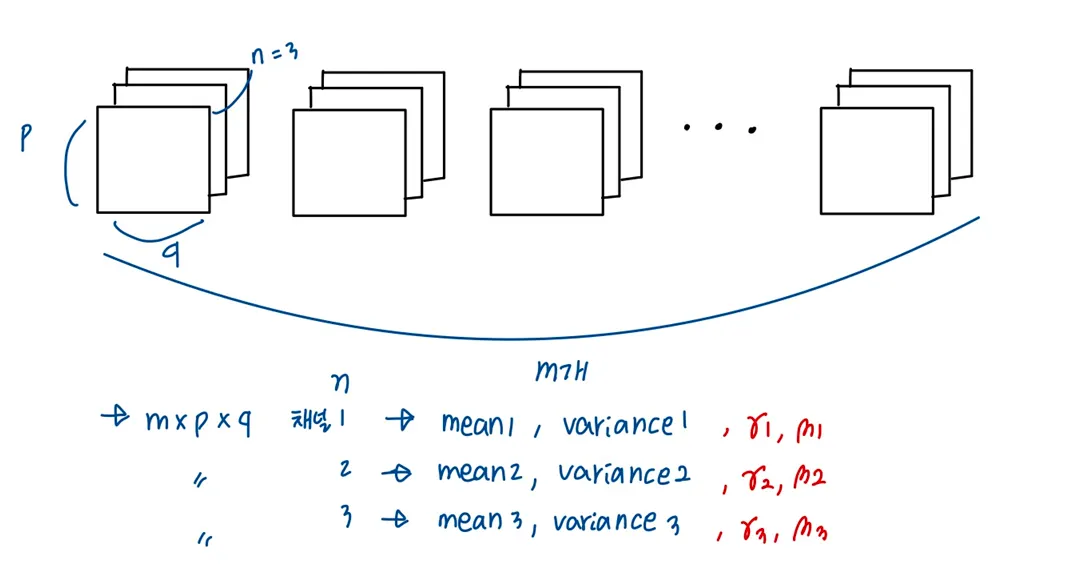 convolution의 성질을 유지시키고 싶기 때문에, 각 channel을 기준으로 각각의 Batch Normalization 변수들을 만든다.