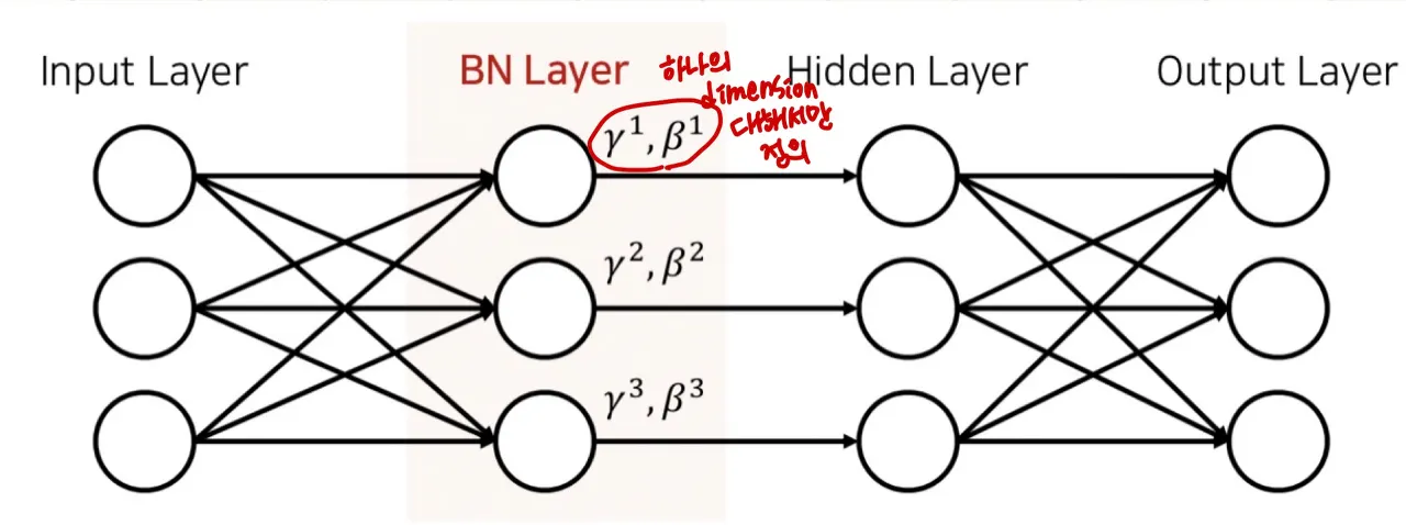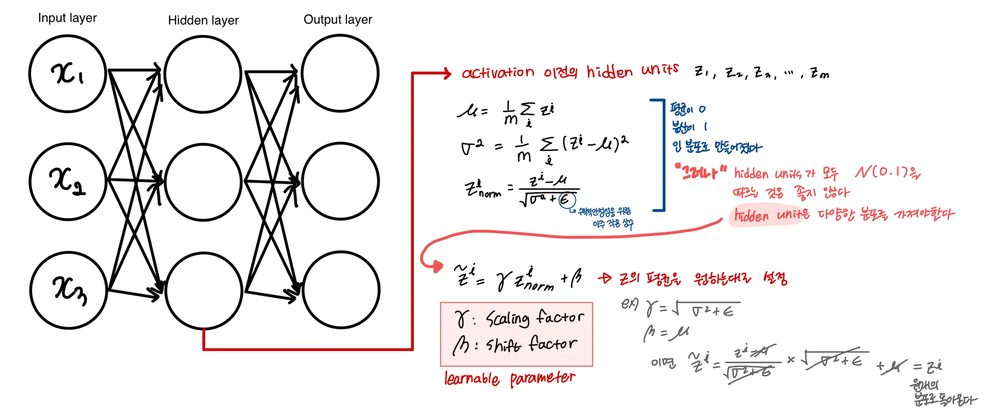 이렇게 구성하여 한 레이어에서 다음 레이어로 전달되는 중간 features도 normalization해주자는 것이 batch normalization이다. 앞의 레이어의 output이 다음 layer의 학습에 영향을 주기 때문에, 중간 features도 normalize하여 학습이 더 잘 되도록 만들어주면 좋을 것이다.