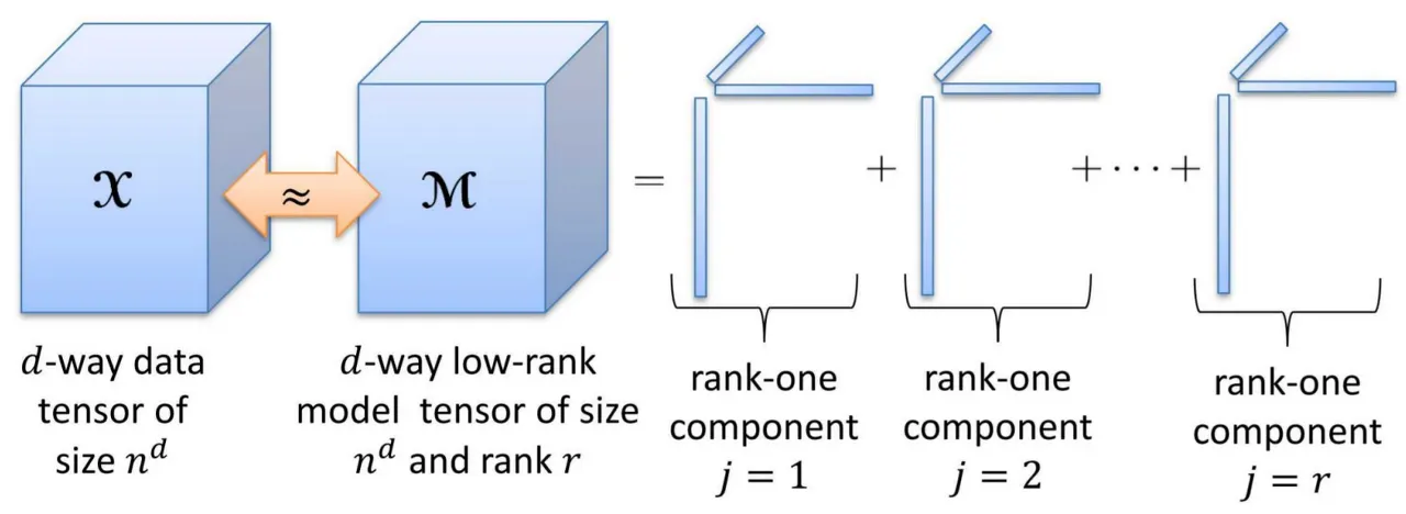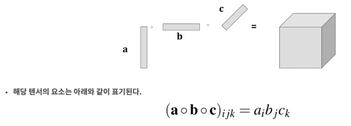a, b, c 의 외적은 하나의 rank가 되고 rank는 총 R개가 존재하게 되어 이 식을 최소화하는 것이 CP Decomposition의 목적이 된다. ( Rank의 합이 x와 유사할수록 이 식이 최소가 됨 )