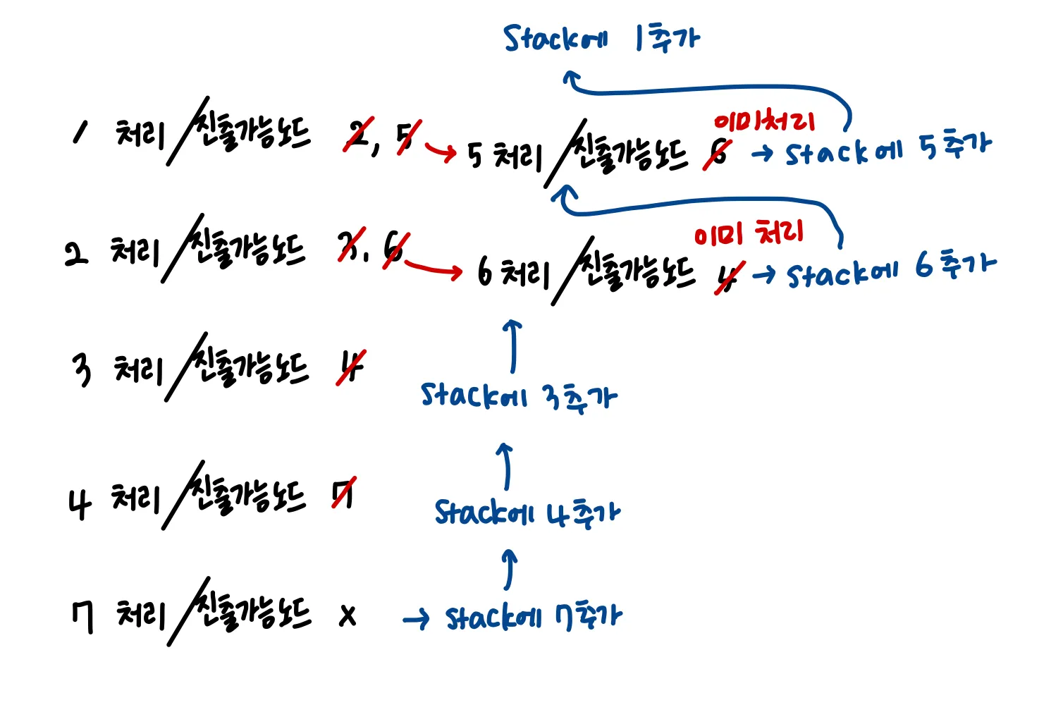 # 이 과정에서 진입차수 0이 되는 노드를 큐에 삽입하면