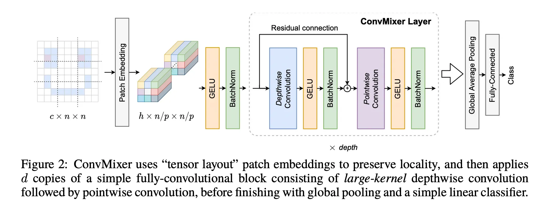 이 의문에 대한 증거를 이 논문에서 제시하며 ConvMixer라는 ViT와 MLP-Mixer에서 영감받은 새로운 아키텍쳐를 제안한다.