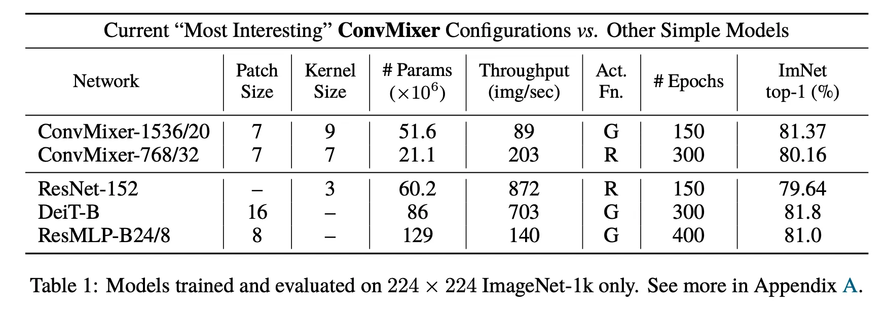 ConvMixer아키텍쳐의 실험결과를 ResNets와 ViT, MLP-Mixer와 비교하지만 ConvMixer는 accuracy나 speed를 위해 설계한 것이 아니다 ( 오직 patch embedding의 영향에 대한 분석을 위해 설계)