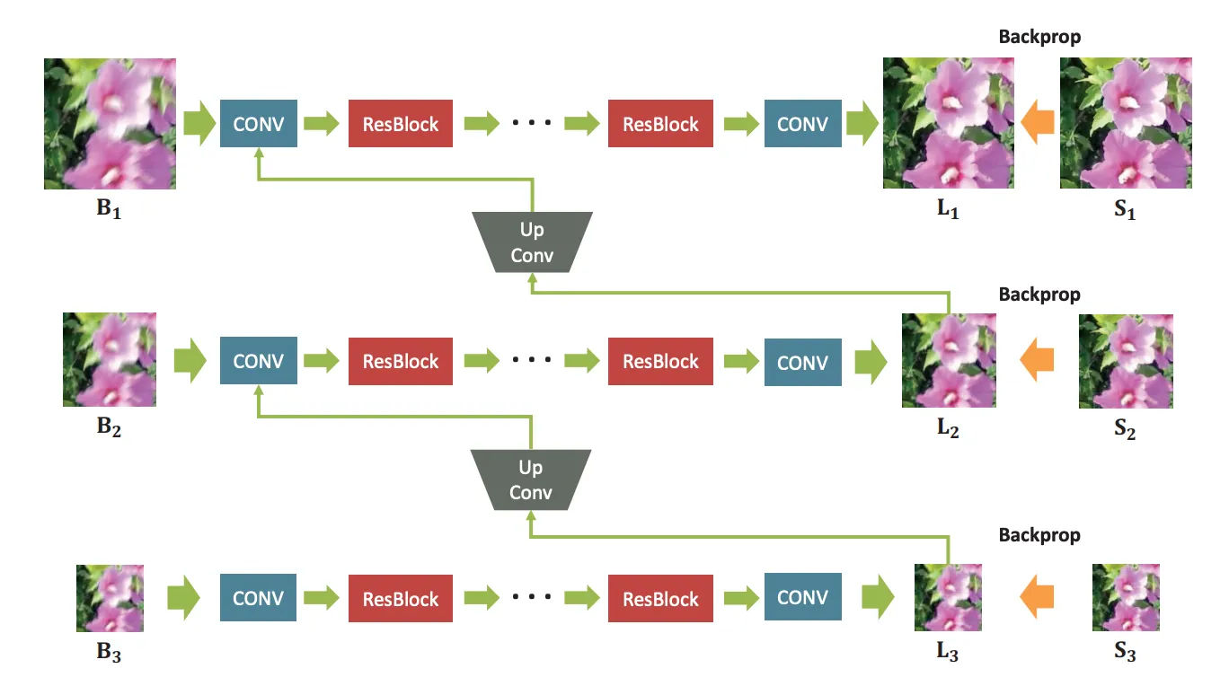 이 그림처럼 blurred image pyramid를 input으로 사용하고 residual blocks를 모든 레벨에서 사용했다