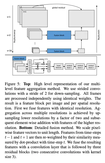 high resolution을 유지하면서 multi resolution features를 사용한다. 이미지 간 객체들의 큰 움직임의 영향을 완화시키기 위해