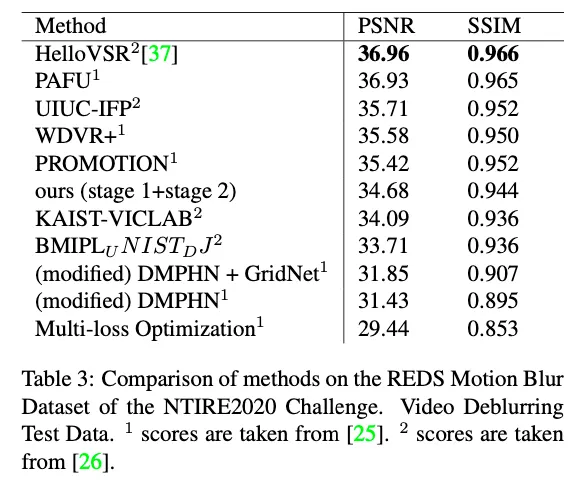 best video score 달성 stage 1 모델로 separately deblurring 해서 stage2로 합치는 방식으로