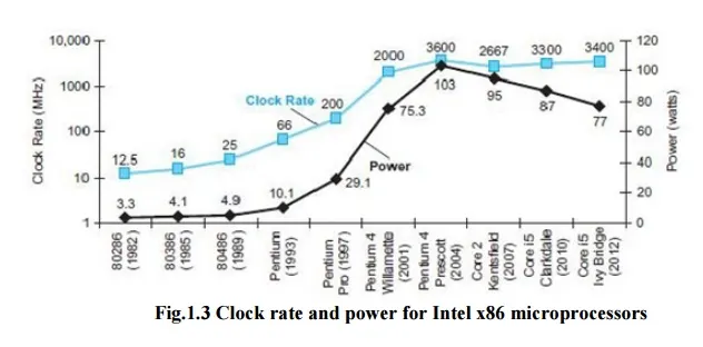 Power는 그래프의 기간 동안 약 30배, Voltage는 1/5배, (Clock)Frequency는 약 1000배가 되었다.