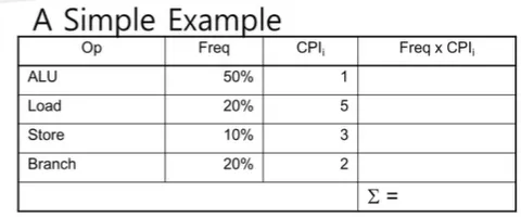 만약 다른 명령어들이 다른 CPI를 갖는다면 Average CPI가 instruction mix(명령어의 조합)에 의해 영향을 받는다.